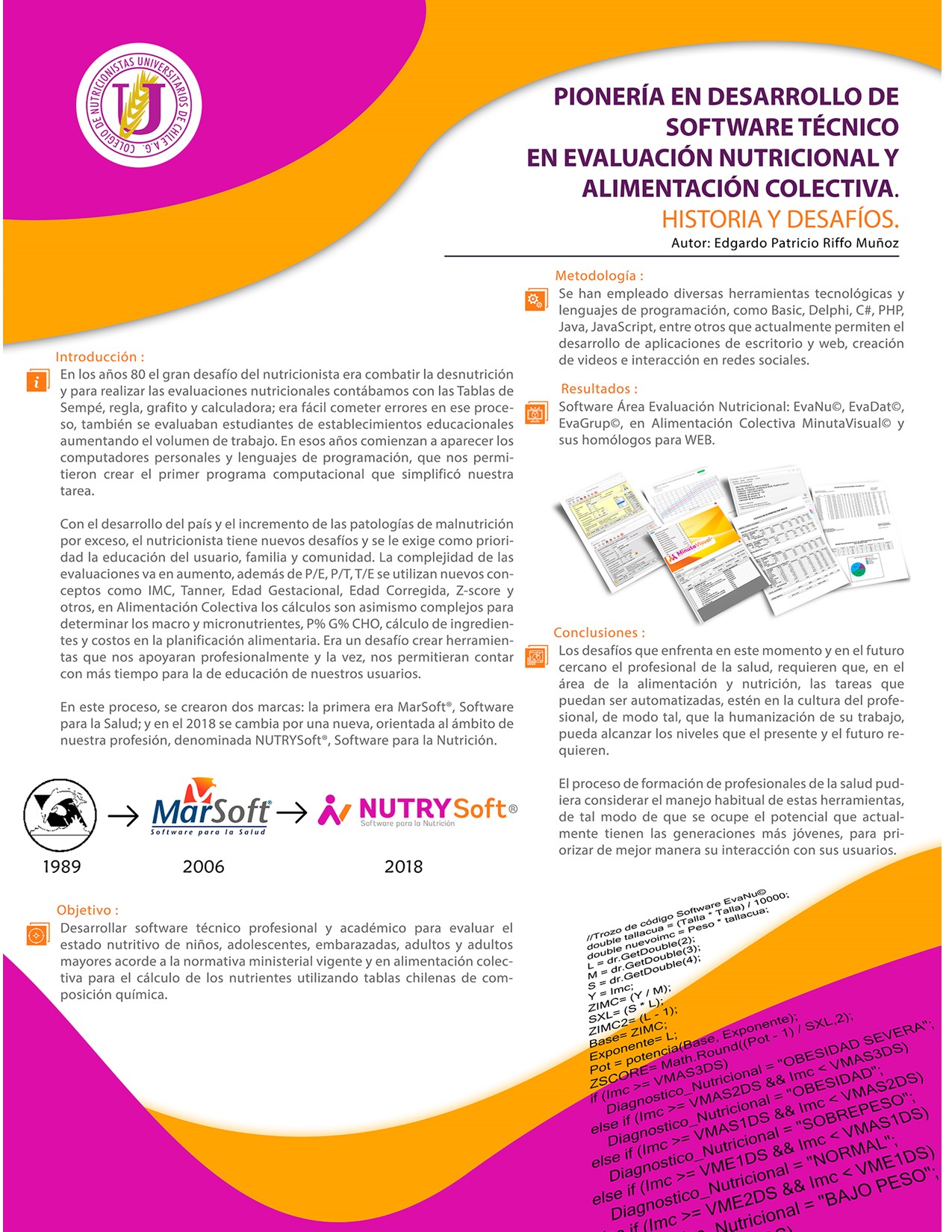 Nuestro primer software, escrito en lenguaje Basic, fue presentado en el Primer Congreso Nacional de Nutricionistas, que tuvo lugar en el Hotel Carrera en 1989. Esta presentación nos otorgó una beca del INTA para participar en un Congreso Internacional sobre Manejo de Datos en Salud.